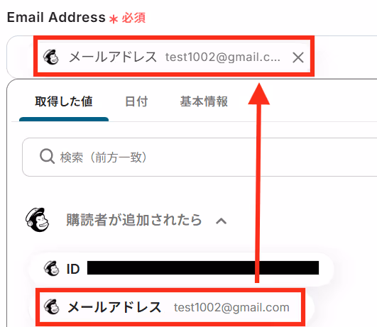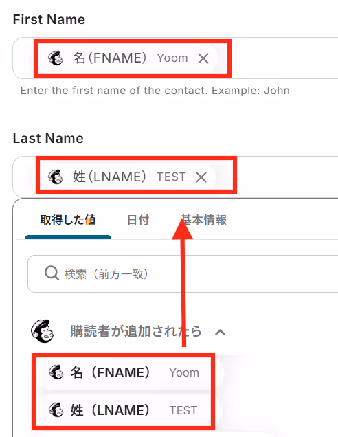 Constant Contactにコンタクトを作成するアクション設定の際、Mailchimpから取得した値の中から、連携したい項目を選択することができます。