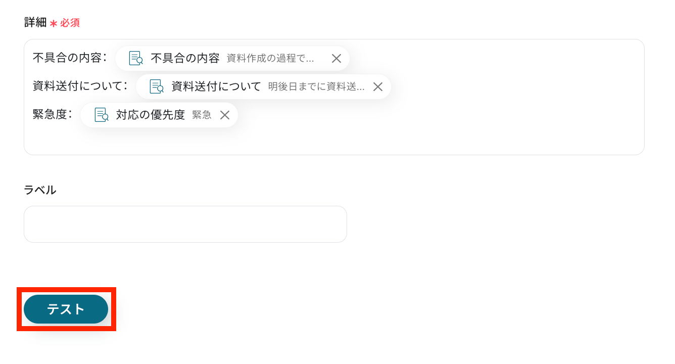 抽出したい項目を手動で設定したら、任意で指示内容を加え、「テスト」ボタンを押しましょう!