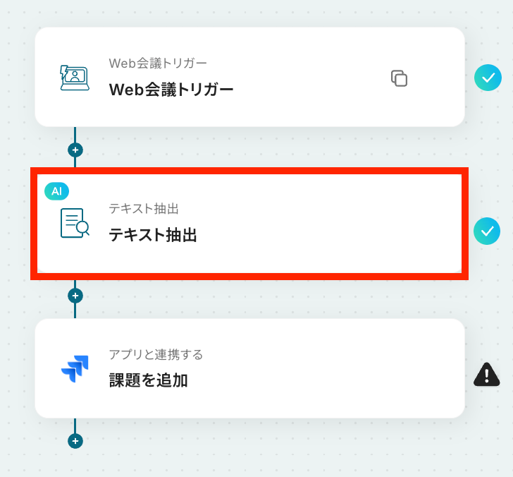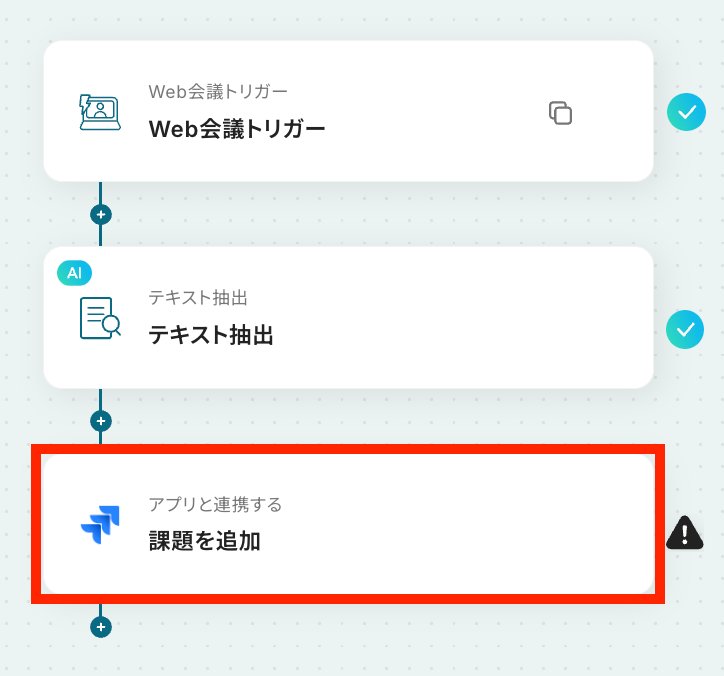 はじめに、Jira SoftwareをYoomと連携します 次に、トリガーでWeb会議トリガーを選択し、「Web会議が終了したら」というアクションを設定します 次に、オペレーションでAI機能の「テキスト抽出」を選択し、会議の音声データから特定の情報を抽出するように設定します 最後に、オペレーションでJira Softwareの「課題を追加」アクションを設定し、抽出したテキスト情報をもとに課題を登録します ※「トリガー」:フロー起動のきっかけとなるアクション、「オペレーション」:トリガー起動後、フロー内で処理を行うアクション■このワークフローのカスタムポイント