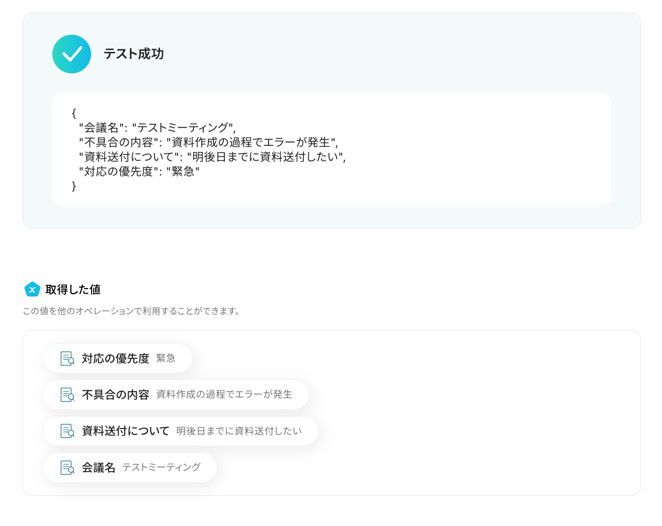 テスト成功で、抽出された項目が取得した値に反映されています。