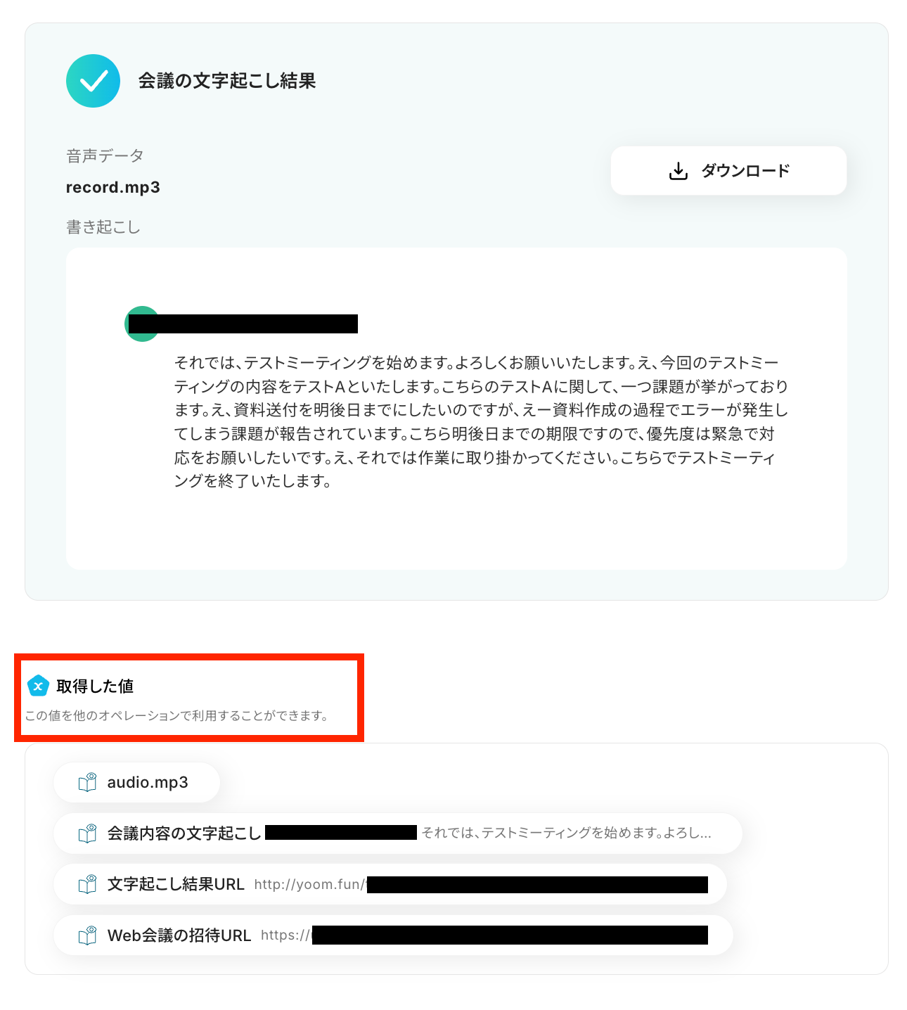 文字起こし結果と取得した値 が確認できたら、「保存する」ボタンを押しておきましょう!
