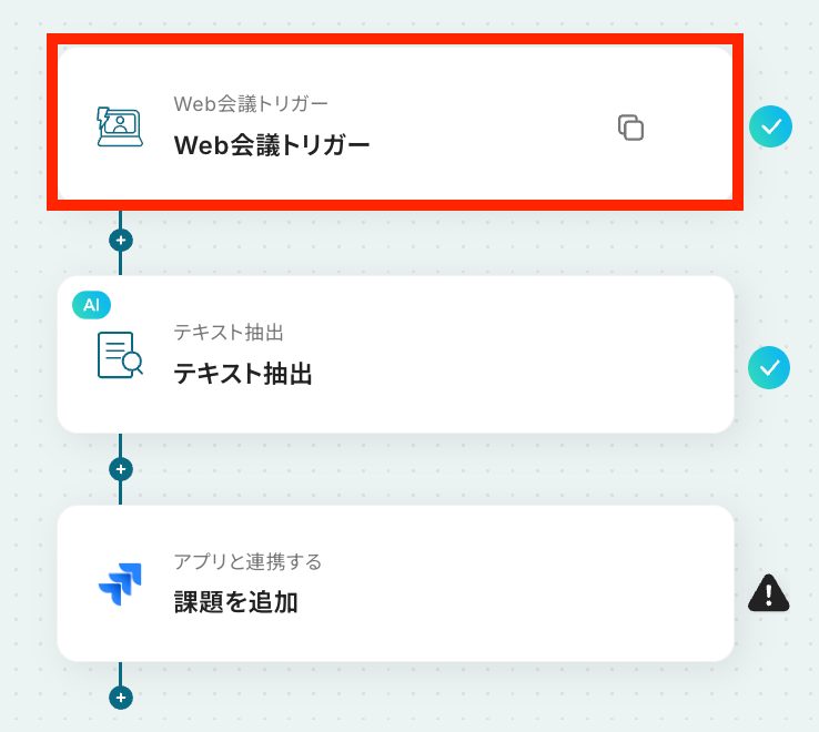 Jira SoftwareとYoomを連携してください。 Web会議トリガーの設定方法や注意点は「Web会議トリガーの設定方法 」をご参照ください。