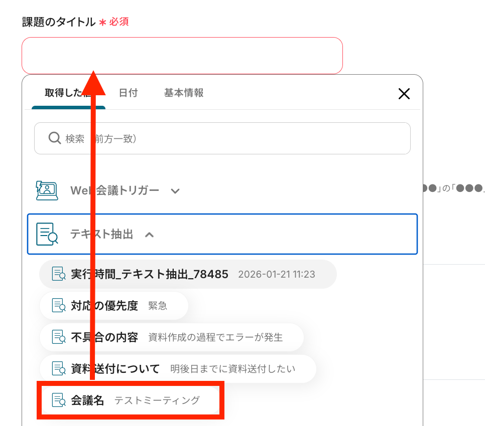 続いて、課題のタイトルを手動または取得した値から選択します。手動で入力する場合は、毎回同じタイトルになるので注意してください。
