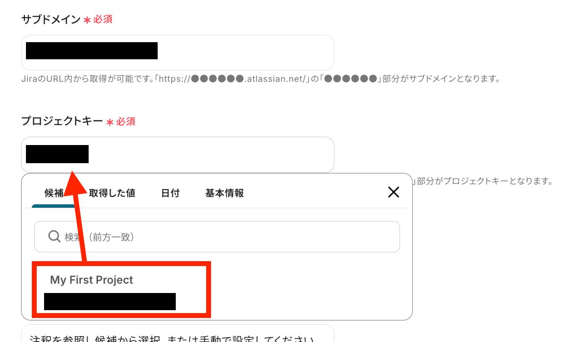 サブドメインをJira Software上で確認して手動で設定し、プロジェクトキーを候補から選択します。