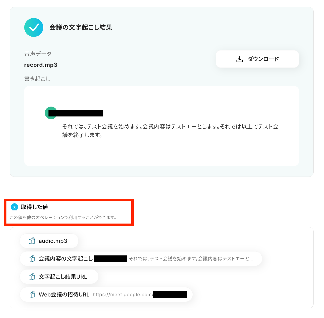 文字起こし結果と取得した値が確認できたら、「保存する」ボタンを押しておきましょう!