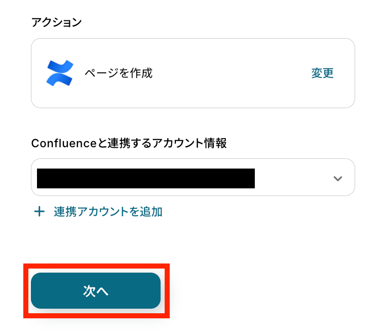 アクションは「ページを作成」のままで、アカウント情報を確認します!