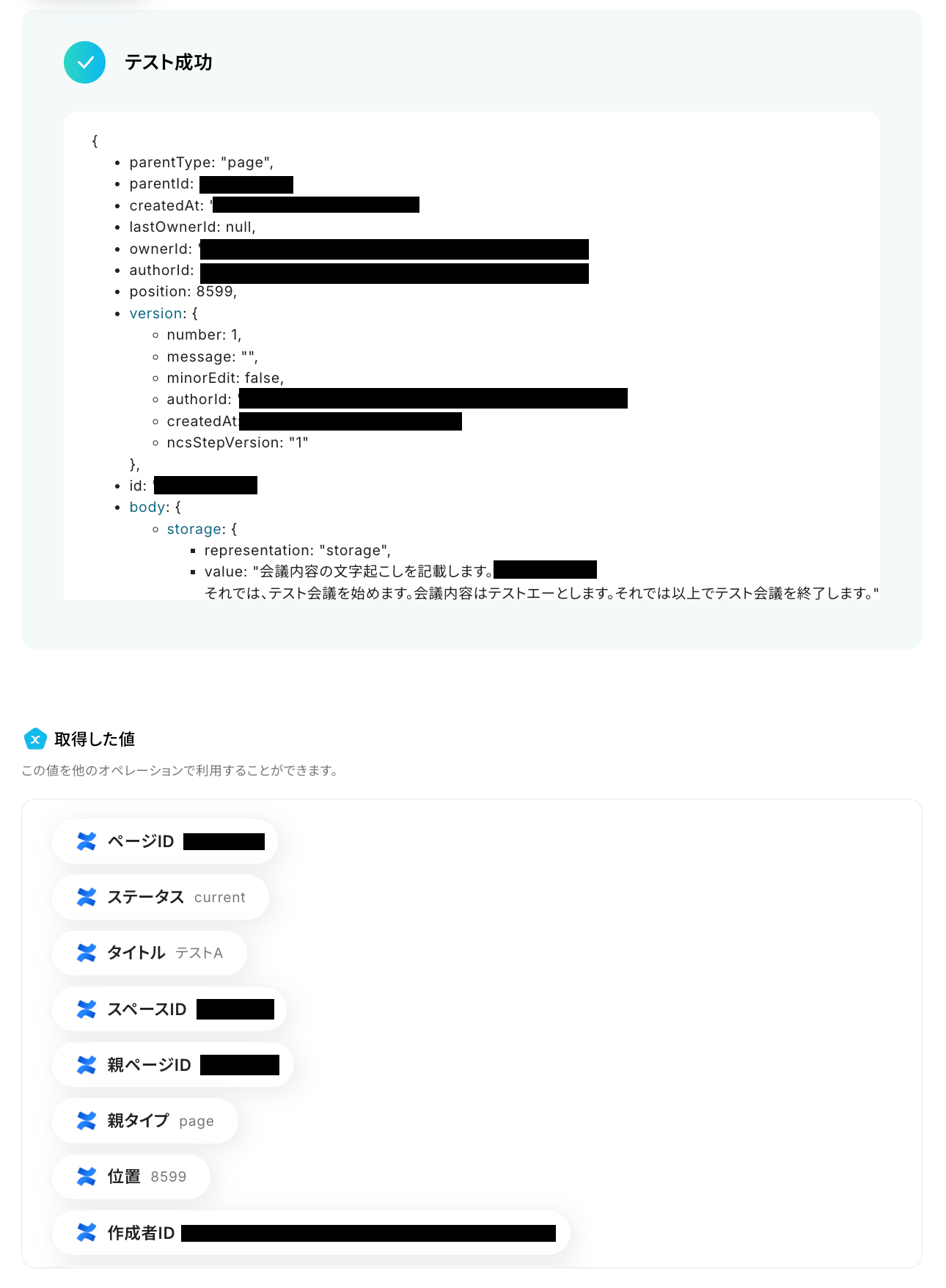 テスト成功という表記が確認できたら、Confluenceで新規ページが作成されています。