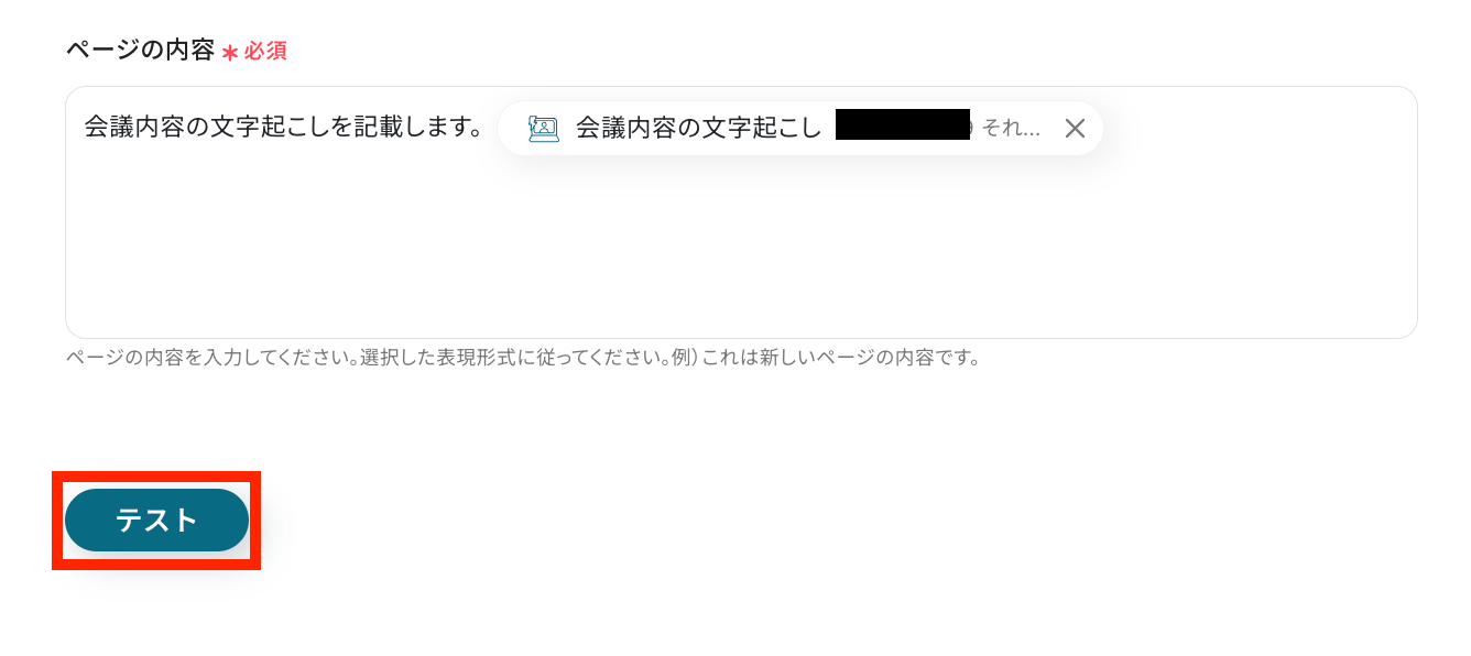 - 作成するページのタイトルや本文には、固定のテキストだけでなく、トリガーで取得した顧客名などの情報を変数として埋め込み、動的に内容を変更できます
