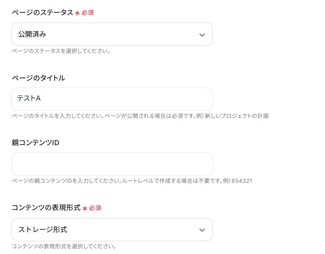 - ページのステータス(公開、下書きなど)やコンテンツの表現形式(Wikiマークアップ、ストレージ形式など)も用途に合わせて設定することが可能です