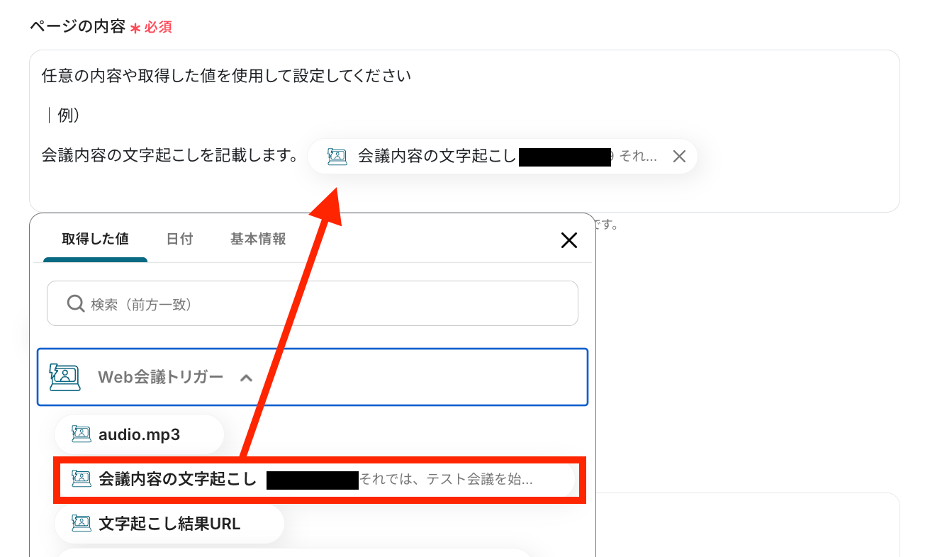 ページの内容は、Web会議トリガーで取得した値を活用して作成が可能です。