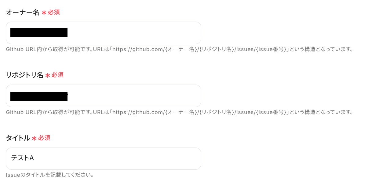- GitHubでIssueを作成、またはコメントを追加するアクションを設定する際に、対象となる任意のオーナー名やリポジトリ名を設定してください