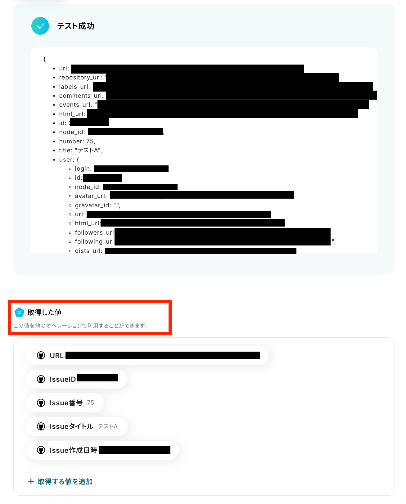 「テスト成功」と表示がされたら、抽出された項目が取得した値に反映されています。