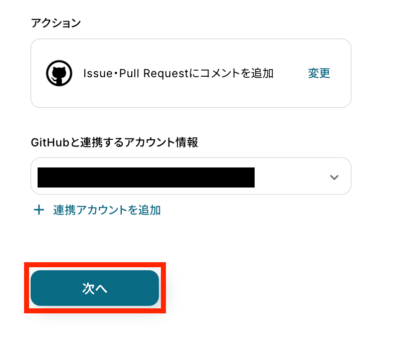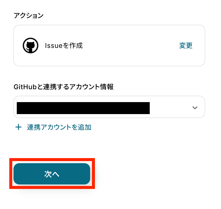 アクションは「Issueを作成」のままで、アカウント情報を確かめます。