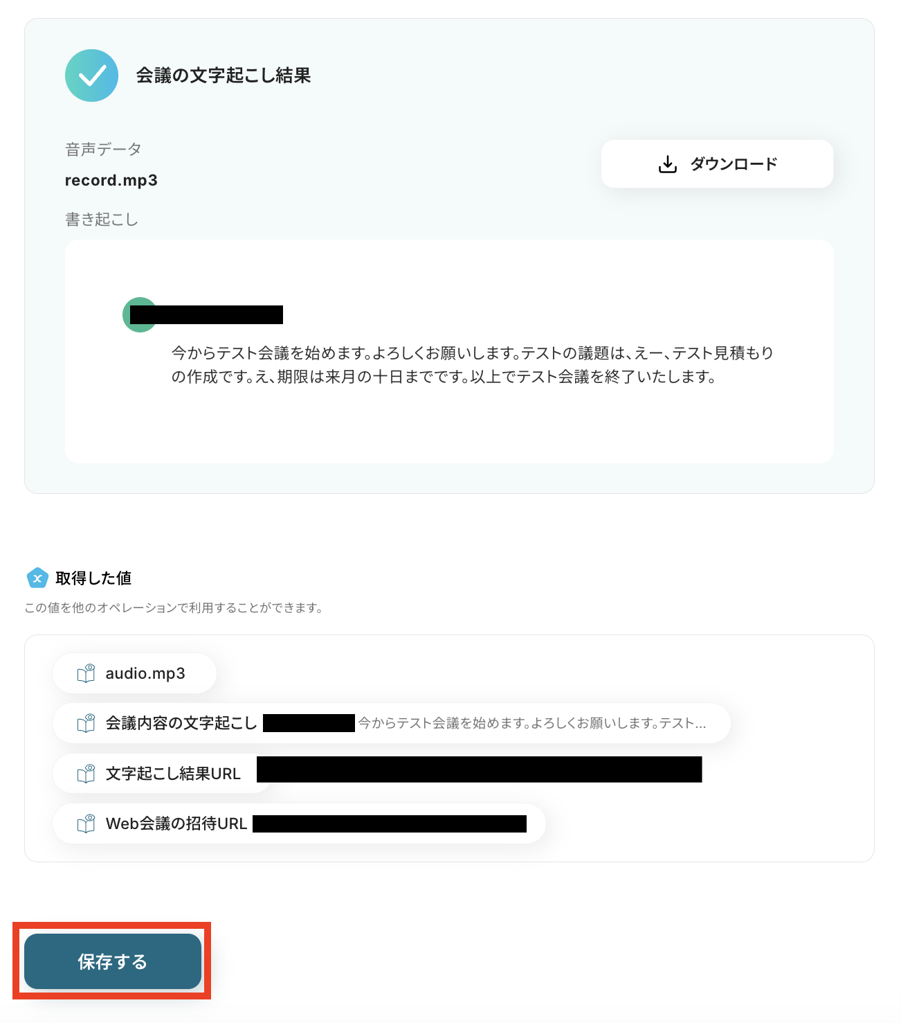 文字起こし結果と取得した値が確認できたら、「保存する」ボタンを押しておきましょう!