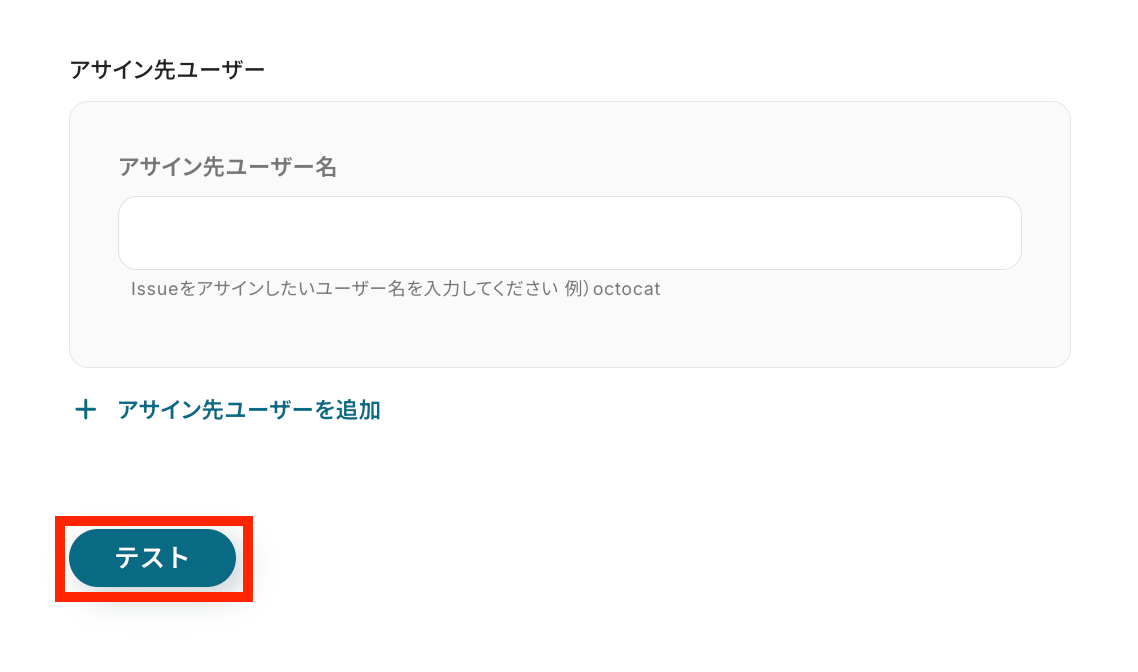 その他、希望に合わせたラベルやアサイン先ユーザーの設定を任意で行い、「テスト」ボタンをクリックします。