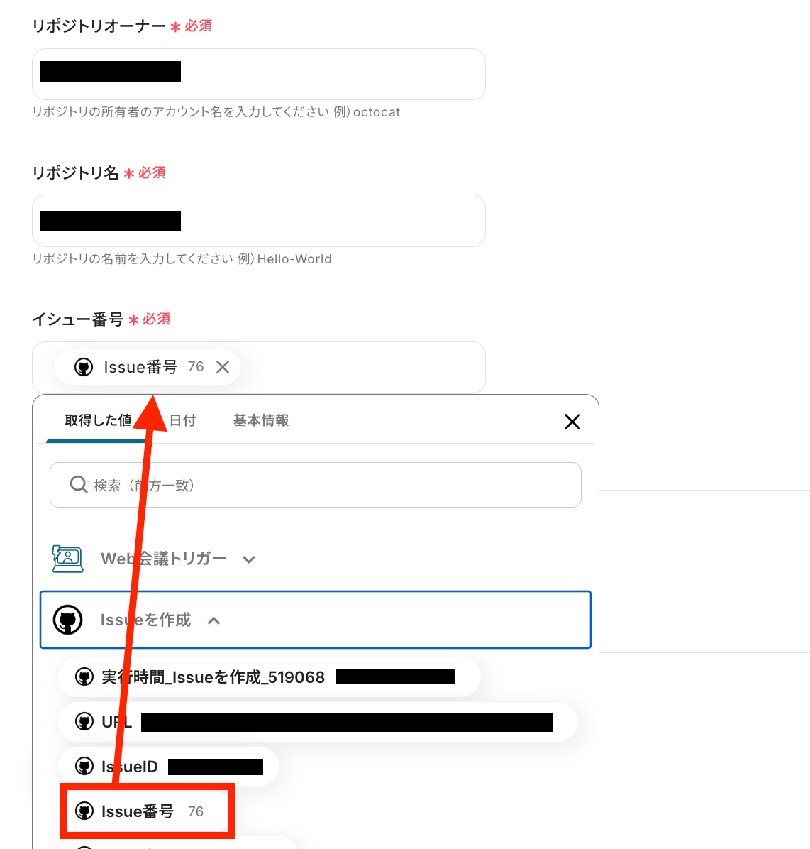 リポジトリオーナーとリポジトリ名をステップ4と同様に設定して、イシュー番号を取得した値から選択します。
