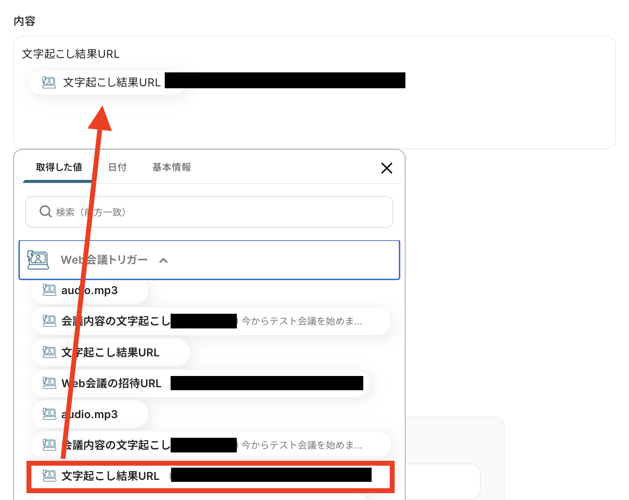 - 次に、オペレーションで「音声文字起こし」を設定し、会議の録画データからテキストを抽出します