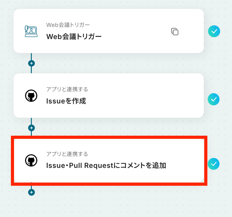 - 最後に、オペレーションでGitHubの「Issue・Pull Requestにコメントを追加」アクションを設定し、詳細な議事録などをコメントとして追記します