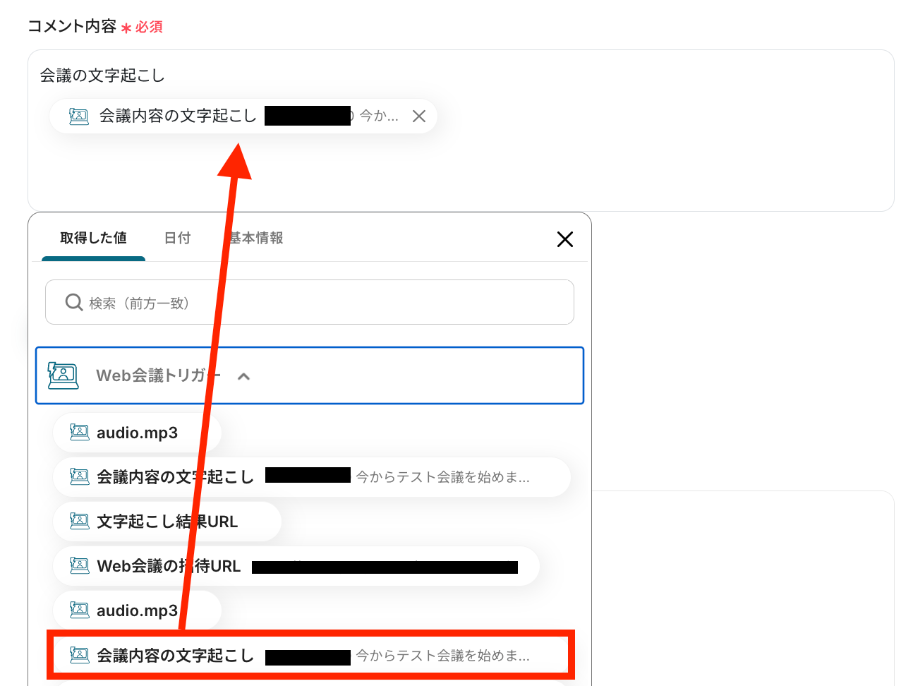 - その次に、音声文字起こし機能の「音声データを文字起こしする」アクションを設定し、ダウンロードしたファイルを処理します。