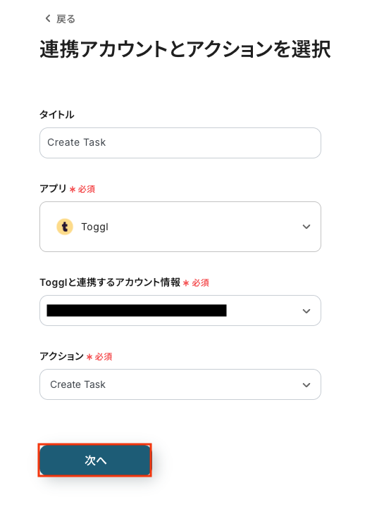 タイトルは任意で変更できます。 アプリとアクションはあらかじめ設定されているため、そのまま内容を確認してください。 Togglと連携するアカウント情報に問題がなければ、「次へ」をクリックします。