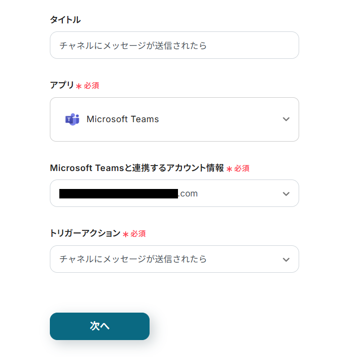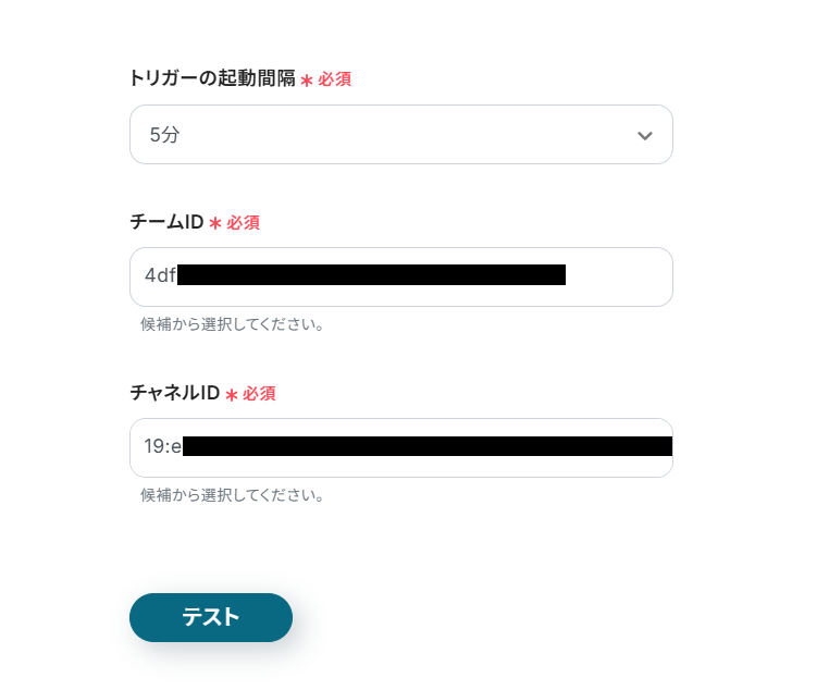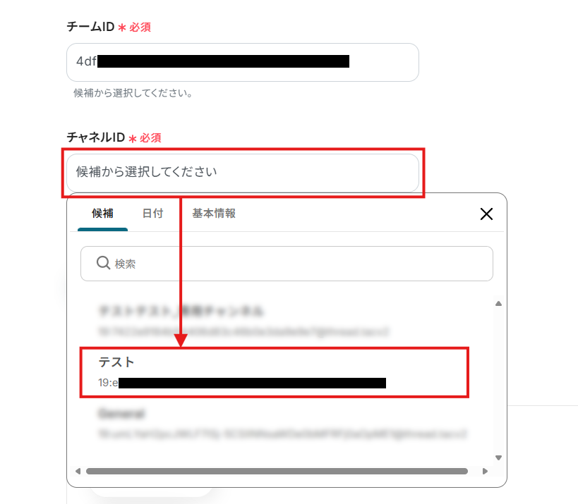 「チャネルID」にトリガーとなるチャネルのIDを設定。 選択したチーム内のチャネルが候補として表示されるため、対象となるチャネルを選択してください。