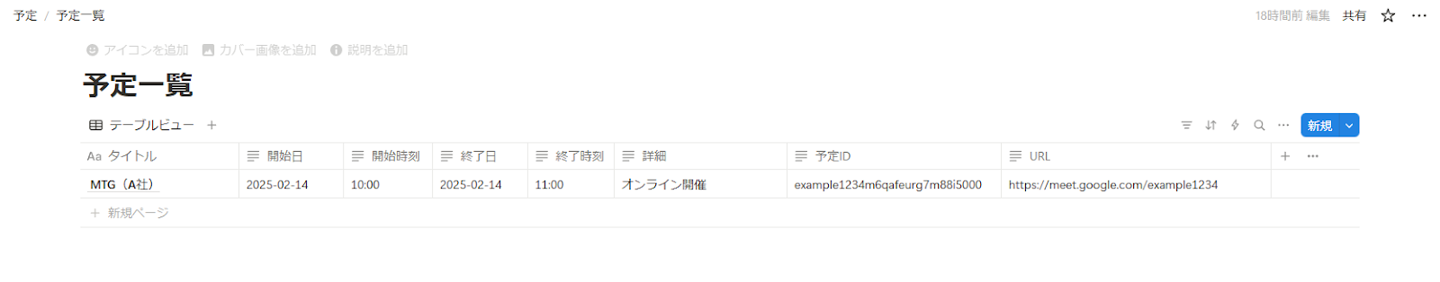 会議予定のレコードを追加するNotionのデータベースをご用意ください。 ここでは例として、下図のデータベースを使用します。
