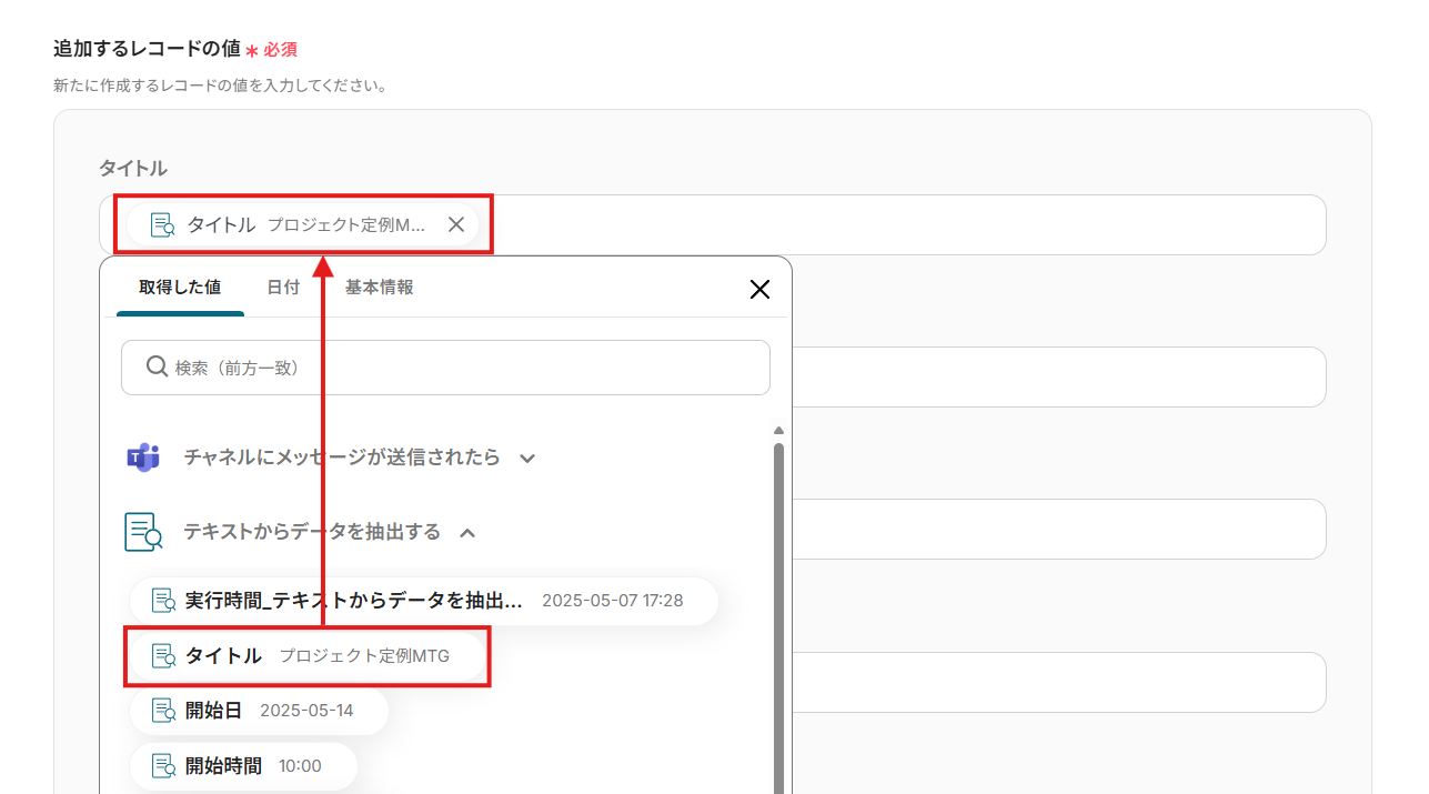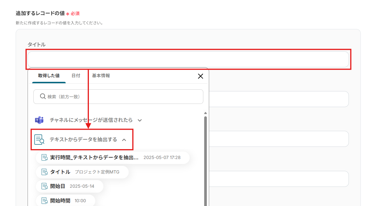 入力欄クリック時に表示される「取得した値」タブのデータ抽出アクションのメニューから、ステップ4で取得した項目が選択できます。 ※ タイトルを変更している場合は、変更後のタイトルが表示されます。 項目をクリックすると、入力欄に{{項目名 追加された値}}という形で追加されます。