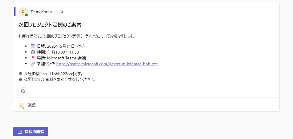 設定を終えたら、Microsoft Teamsの指定したチャネルに、レコードに追加したい内容を投稿してください。 ※ 投稿するメッセージの例