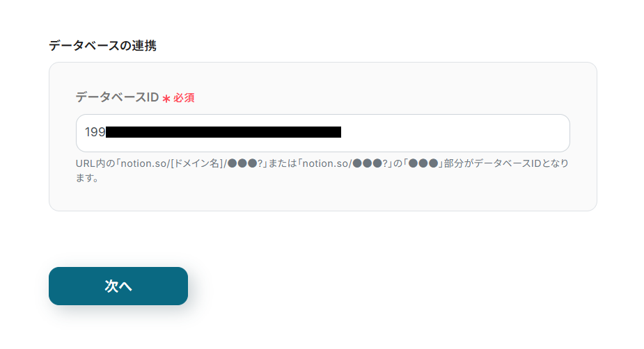 データベースの連携の「データベースID」に前準備で用意したデータベースのIDを設定。 入力欄をクリックすると、連携しているNotionから候補が表示されますので、対象となるデータベースを選択してください。 検索欄にデータベース名を入力すると検索が楽になります。 データベースIDはNotionのデータベースURLでも確認できます。 ※ 詳細は入力欄下の案内をご確認ください。