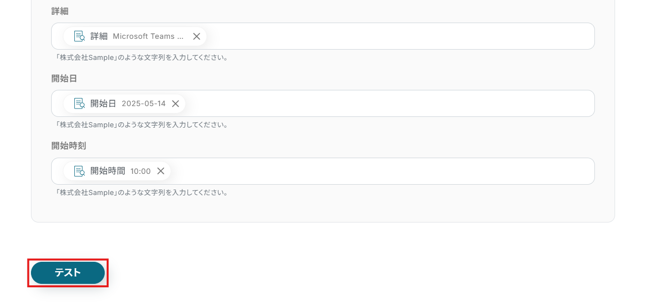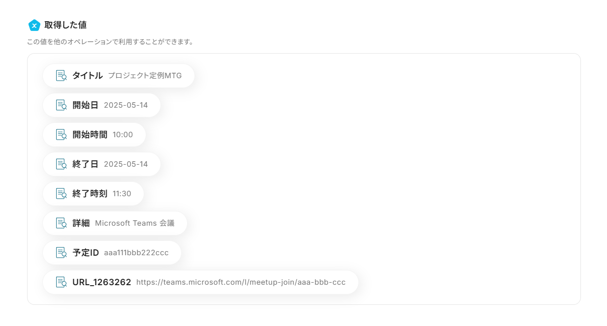 テストに成功すると、「抽出したい項目」に設定した項目がメッセージから抽出され、「取得した値」に追加されます。