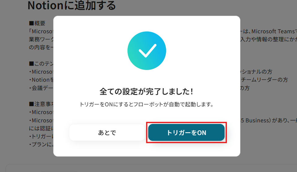 ■概要 「Microsoft Teamsで特定条件の会議情報が投稿されたら、データを抽出してNotionに追加する」フローは、Microsoft Teams上での会議管理を効率化する業務ワークフローです。 会議情報を手動で管理するのは手間がかかります。このワークフローを活用することで、特定の条件に合致した会議情報を自動的に抽出し、Notionに整理することで、 情報の一元管理が可能になります。これにより、会議のスケジュールや内容の把握が容易になり、業務の効率化が期待できます。 ■このテンプレートをおすすめする方 ・Microsoft Teamsで頻繁に会議を開催し、その管理に手間を感じているビジネスパーソンの方 ・会議情報をNotionで一元的に管理し、チーム全体で共有したいと考えているプロジェクトリーダーの方 ・手動での会議データ入力に時間を取られ、業務効率化を図りたいと考えている管理職の方 ■注意事項 ・Microsoft Teams、NotionのそれぞれとYoomを連携してください。 ・Microsoft365(旧Office365)には、家庭向けプランと一般法人向けプラン(Microsoft365 Business)があり、一般法人向けプランに加入していない場合には認証に失敗する可能性があります。 ・分岐はミニプラン以上のプランでご利用いただける機能(オペレーション)となっております。フリープランの場合は設定しているフローボットのオペレーションはエラーとなりますので、ご注意ください。 ・ミニプランなどの有料プランは、2週間の無料トライアルを行うことが可能です。無料トライアル中には制限対象のアプリや機能(オペレーション)を使用することができます。 ・トリガーは5分、10分、15分、30分、60分の間隔で起動間隔を選択できます。 ・プランによって最短の起動間隔が異なりますので、ご注意ください。