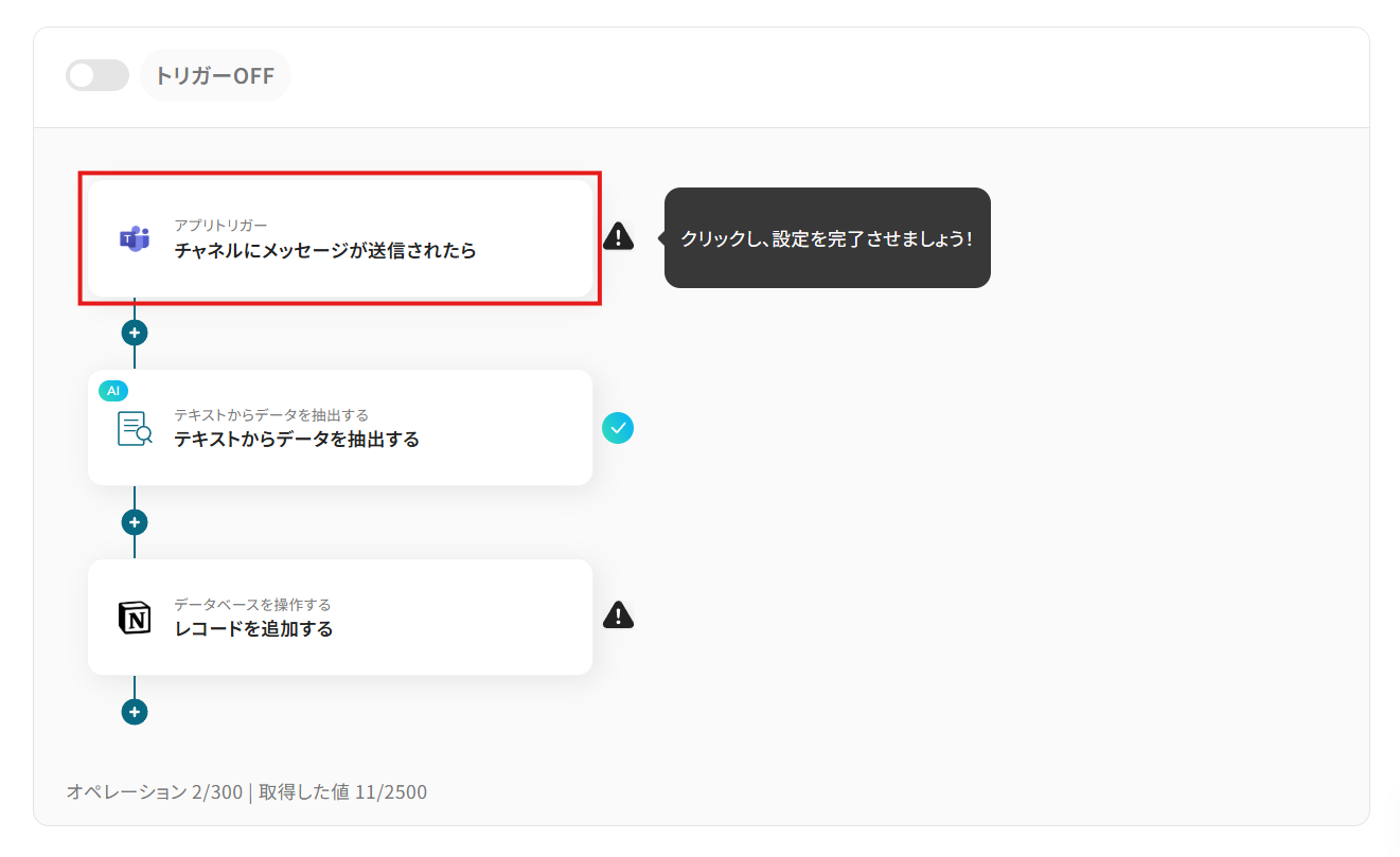 フロー画面に戻り、「全ての設定が完了しました!」と表示されていればフローの設定は完了です。 早速フローを稼働させるのであれば、「トリガーをON」をクリックします。