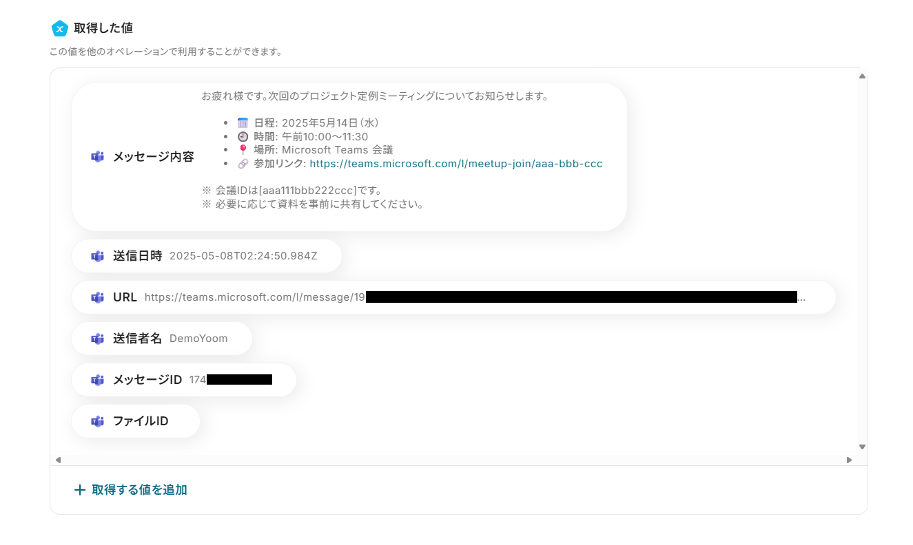 テストに成功すると、「取得した値」に投稿されたメッセージの情報が追加されます。