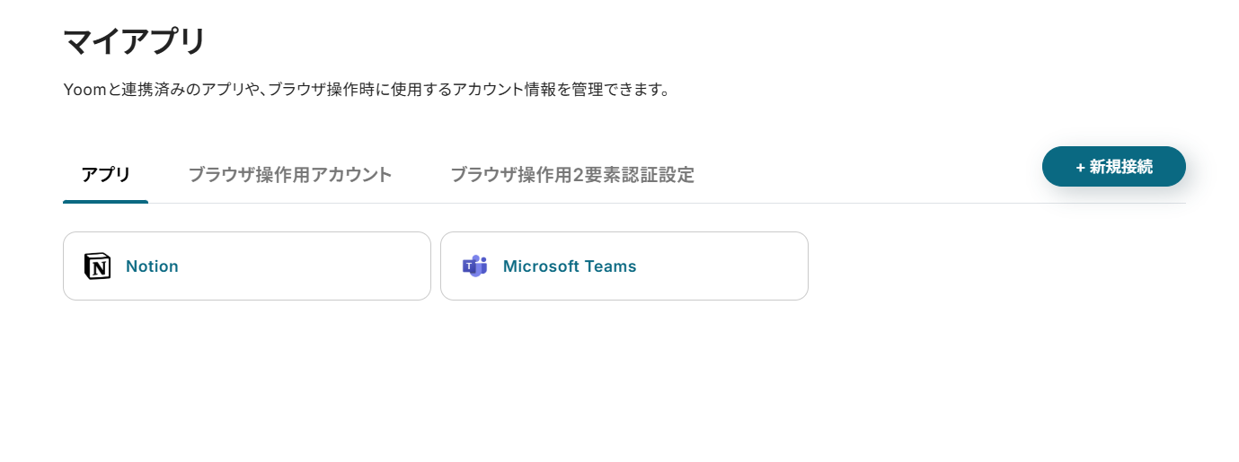 先ずは、Yoomと連携させたいMicrosoftアカウントとNotionアカウントを「マイアプリ」に登録しましょう。 この設定は初回のみ必要です。