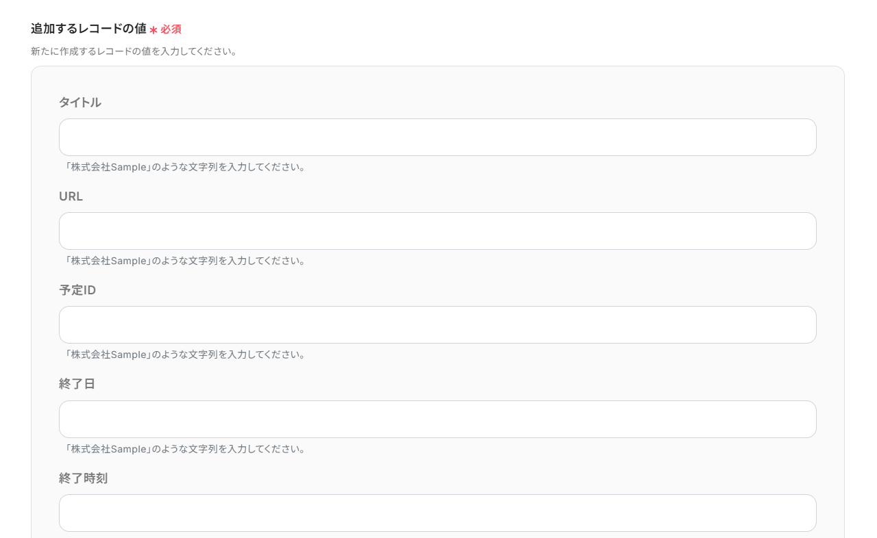 指定したデータベースに沿った項目が「追加するレコードの値」に表示されます。 各項目に、ステップ4で抽出したデータを設定していきましょう。