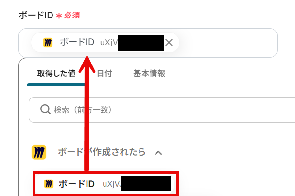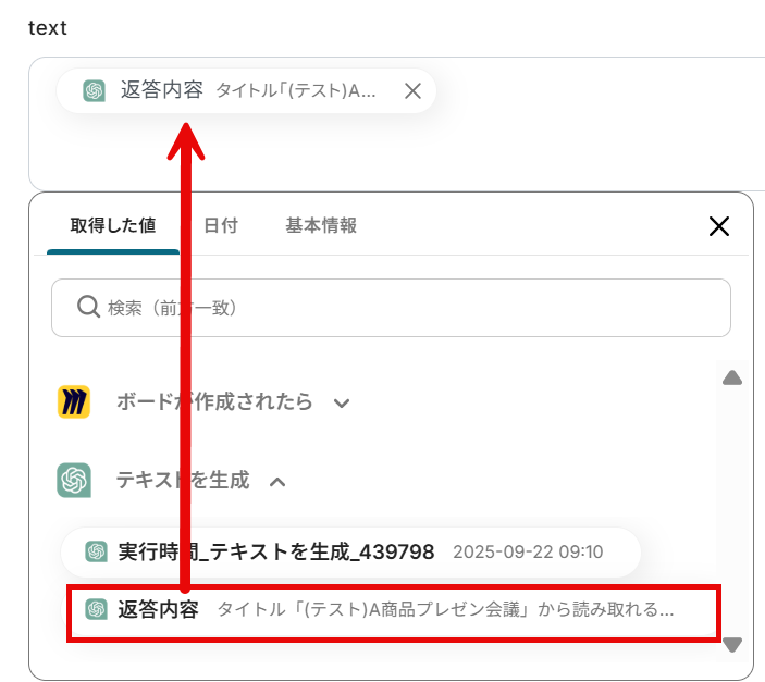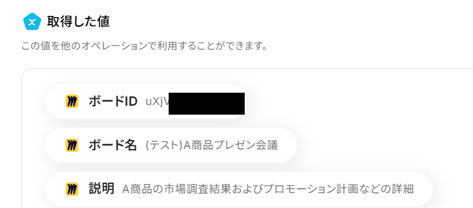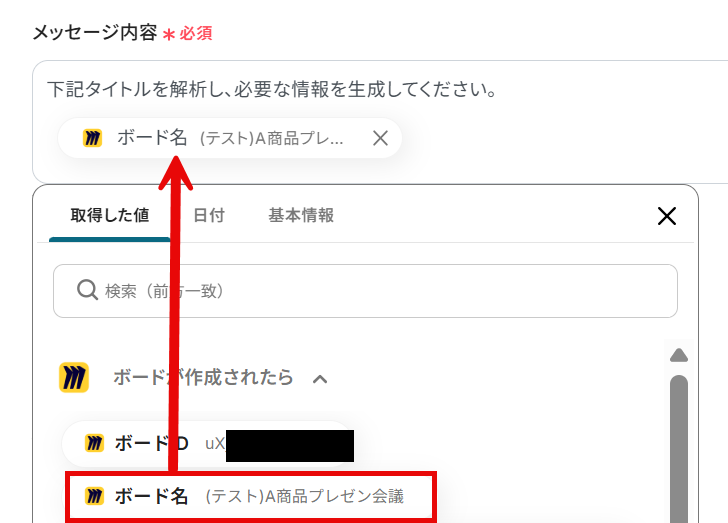 メッセージ内容に、指示文と前項で取得した値から「ボード名」を選択します。