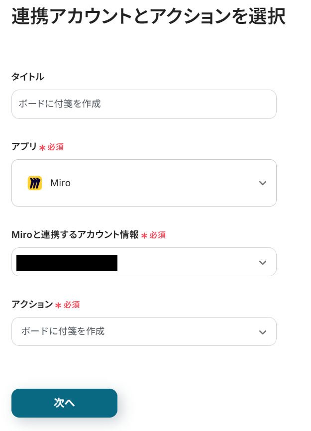 - トリガーアクション:Miroでボードが作成されたら起動します。