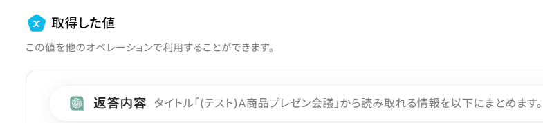 テストに成功すると、ChatGPTの返答内容の値が取得されます。