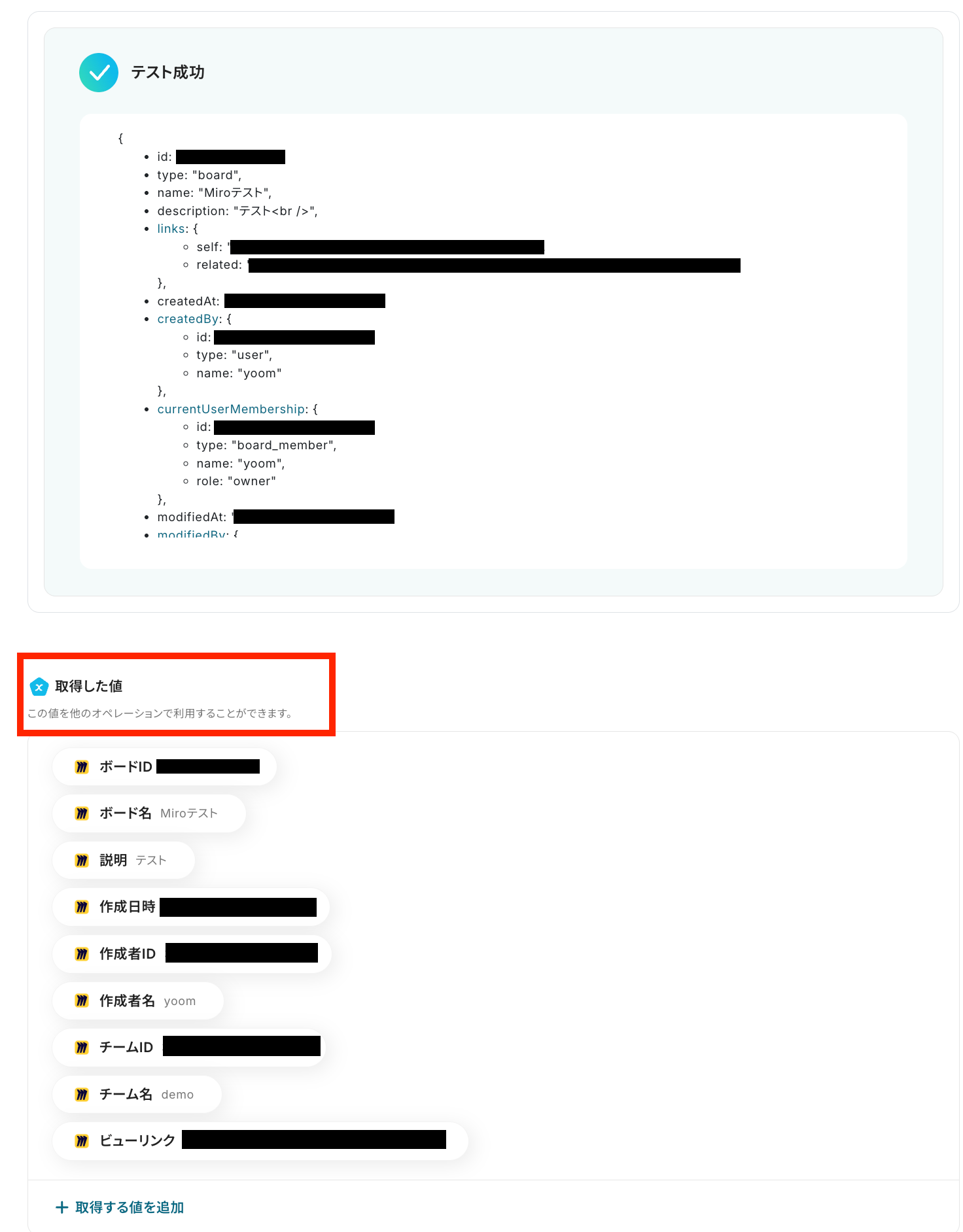 チームIDをMiroの設定ページ内で確認したら、記入して「テスト」を実行してください。