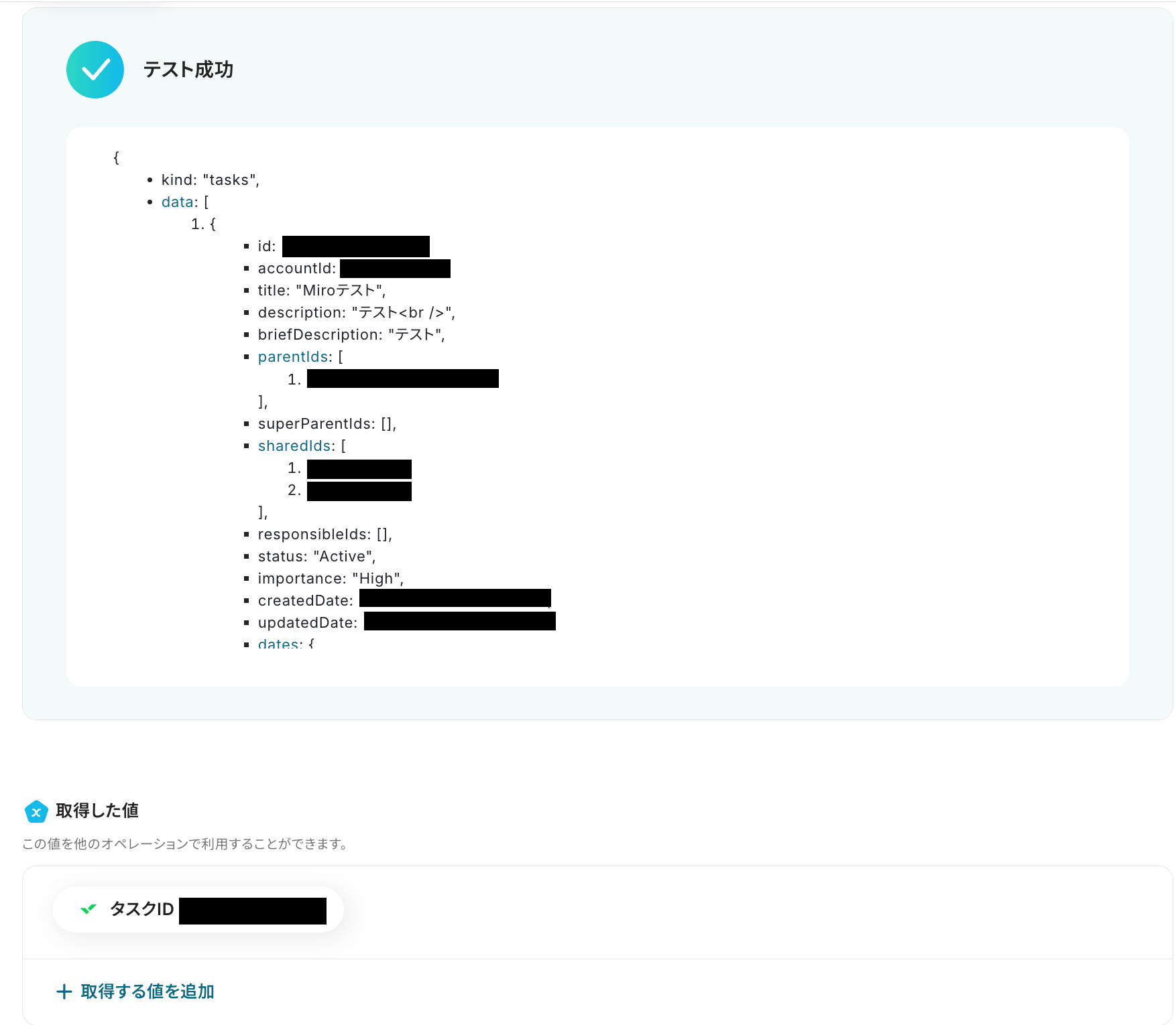 テスト成功で、取得した値に値が反映されます。
