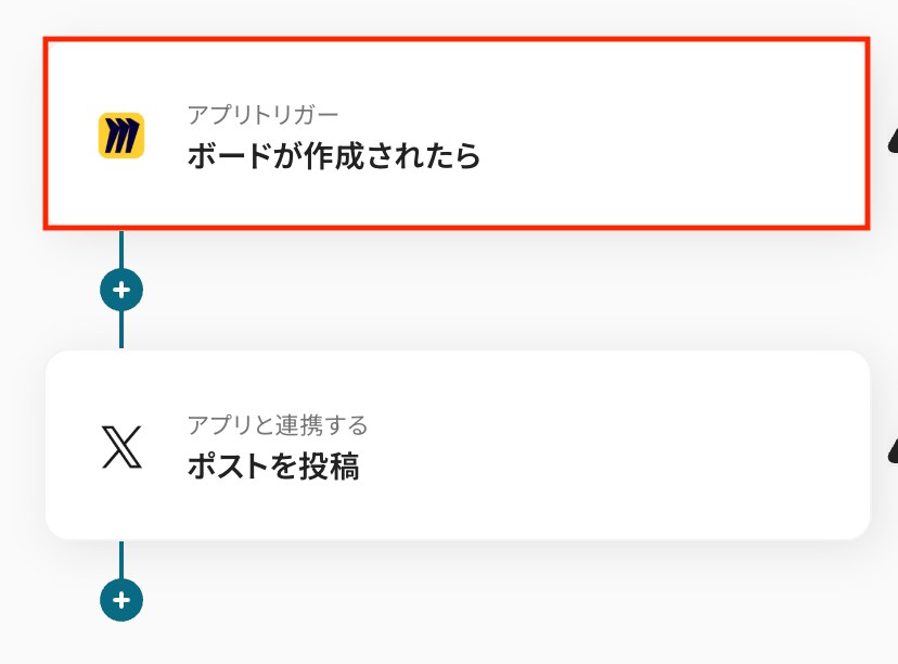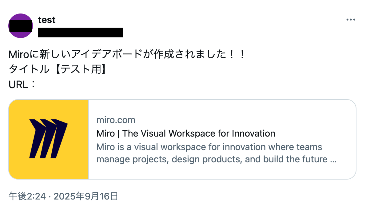 このワークフローを活用すれば、Miroで新しいボードが作成されると、その情報を自動でX(Twitter)にポストできます。