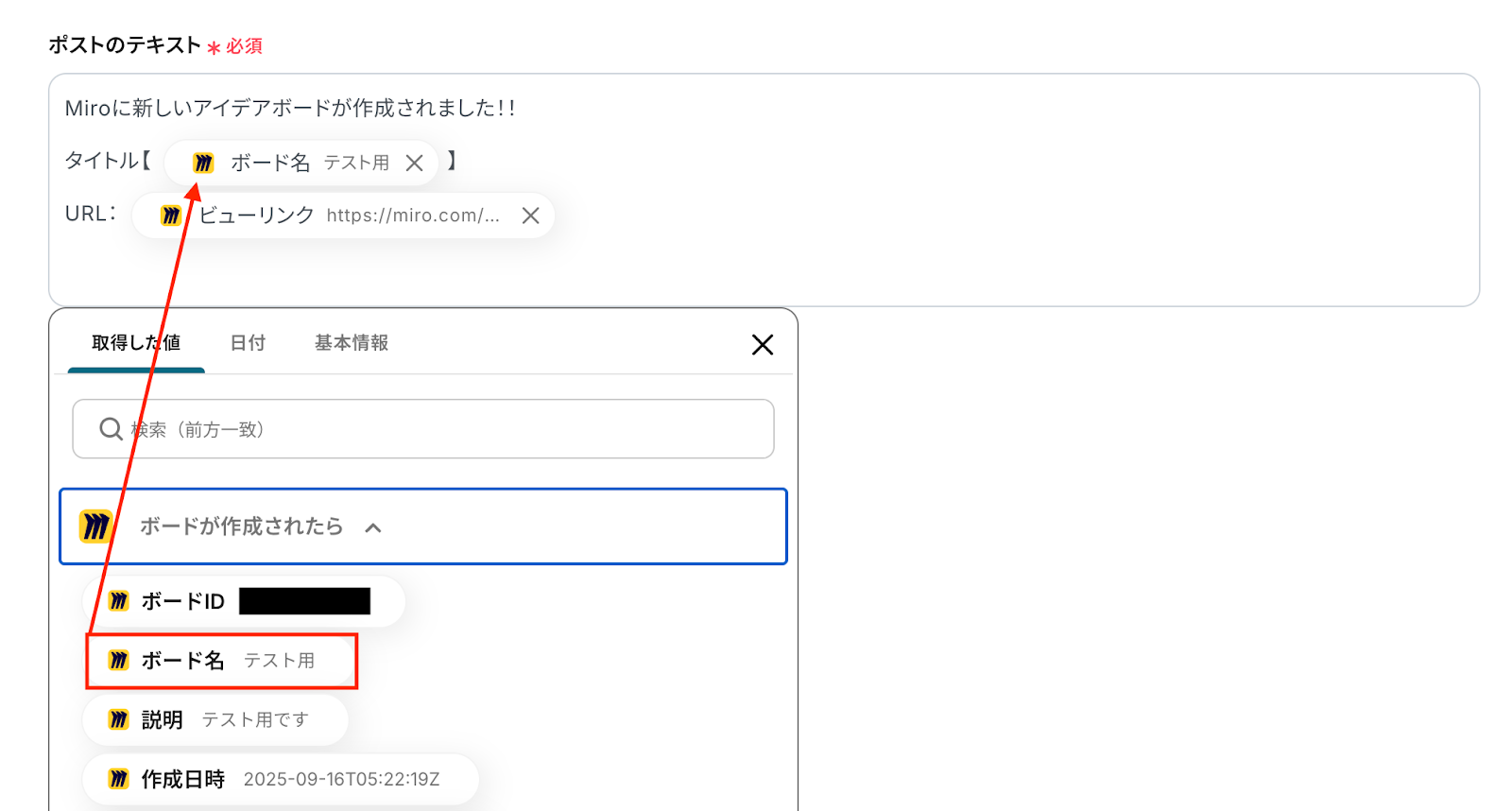 例えば「ボードの作成者名」「作成日時」「説明文」など、取得した値の中から目的に合った項目を選んで投稿内容に組み込むことが可能です。(以下の画像の取得した値一覧参照)