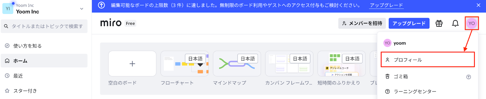 Miroにログイン後、右上のプロフィールアイコンをクリックし、「プロフィール」をクリックします。