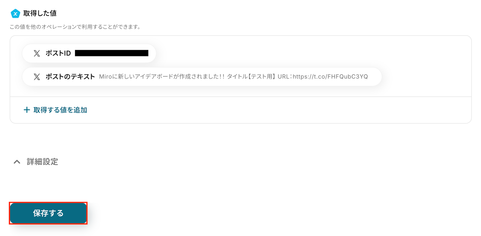 なお、テキストを直接入力した部分は固定値とされるため、アウトプットを活用せず設定を行うと毎回同じ内容のポストがX(Twitter)に投稿されてしまうので注意が必要です。