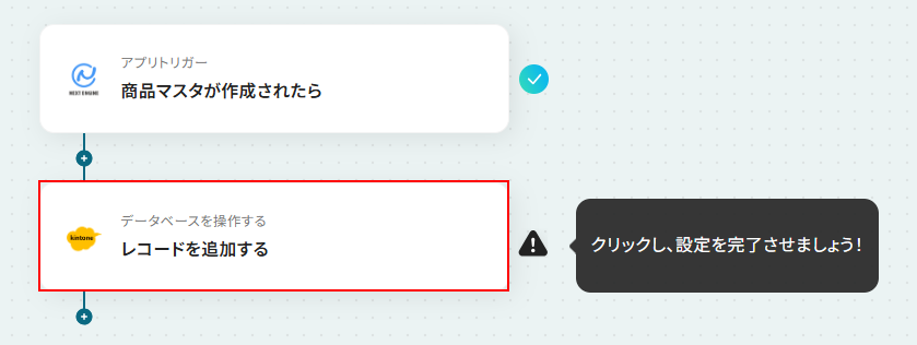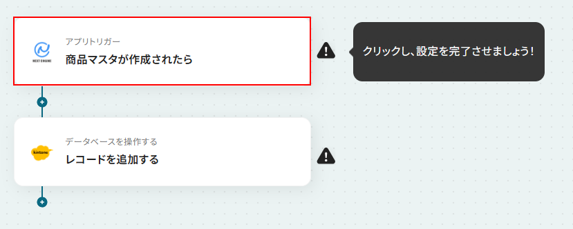 はじめに、NEXT ENGINEとkintoneをYoomと連携します。 次に、トリガーでNEXT ENGINEを選択し、「商品マスタが作成されたら」というアクションを設定します。 最後に、オペレーションでkintoneの「レコードを追加する」アクションを設定し、NEXT ENGINEから取得した商品情報をkintoneの指定アプリに記録します。 ※「トリガー」:フロー起動のきっかけとなるアクション、「オペレーション」:トリガー起動後、フロー内で処理を行うアクション ■このワークフローのカスタムポイント