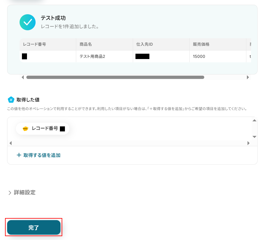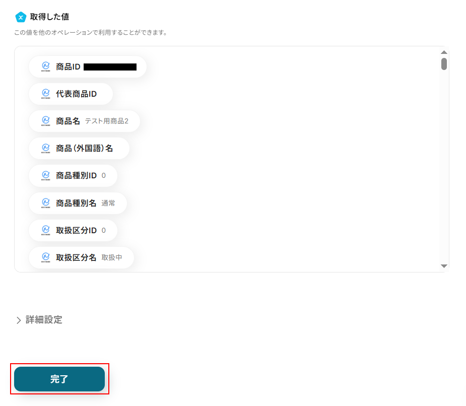 テストに成功するとテスト成功画面と取得した値が表示されますのでご確認ください。 確認できたら完了 をクリックしましょう。