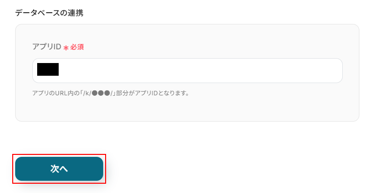 アプリIDを設定します。 入力欄をクリックし、表示された候補の中から使用することも可能ですが、使用するアプリのURLから取得することもできます。 アプリIDはURLの以下の箇所にありますのでコピーして入力してください。 https://サブドメイン.cybozu.com/k/アプリID /