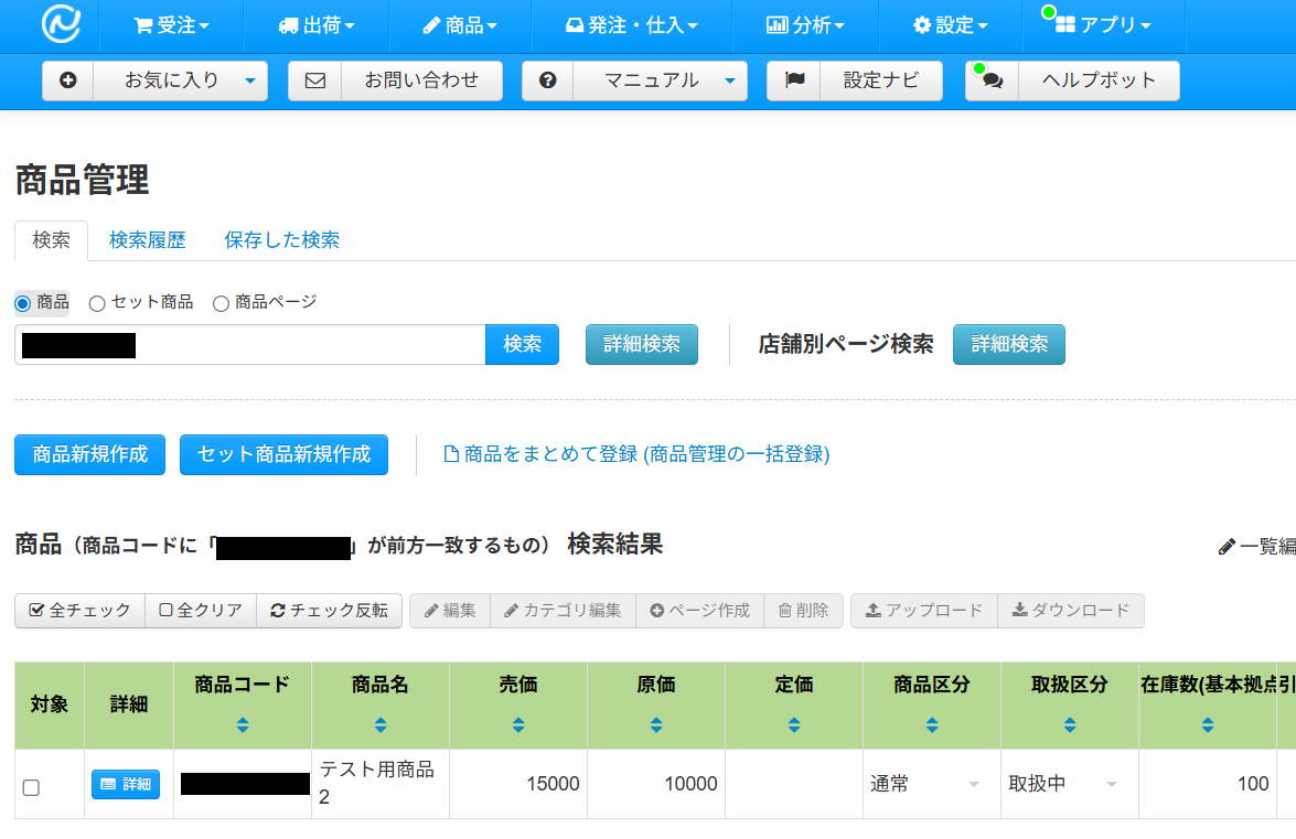 NEXT ENGINEの画面に移動し、商品を新規作成しましょう。 今回ご紹介するテンプレートは、NEXT ENGINEに商品マスタが作成されたら起動します。 そのため、実際にテストを行うには商品を新規作成する必要があります。 今回は以下の商品を作成しました。