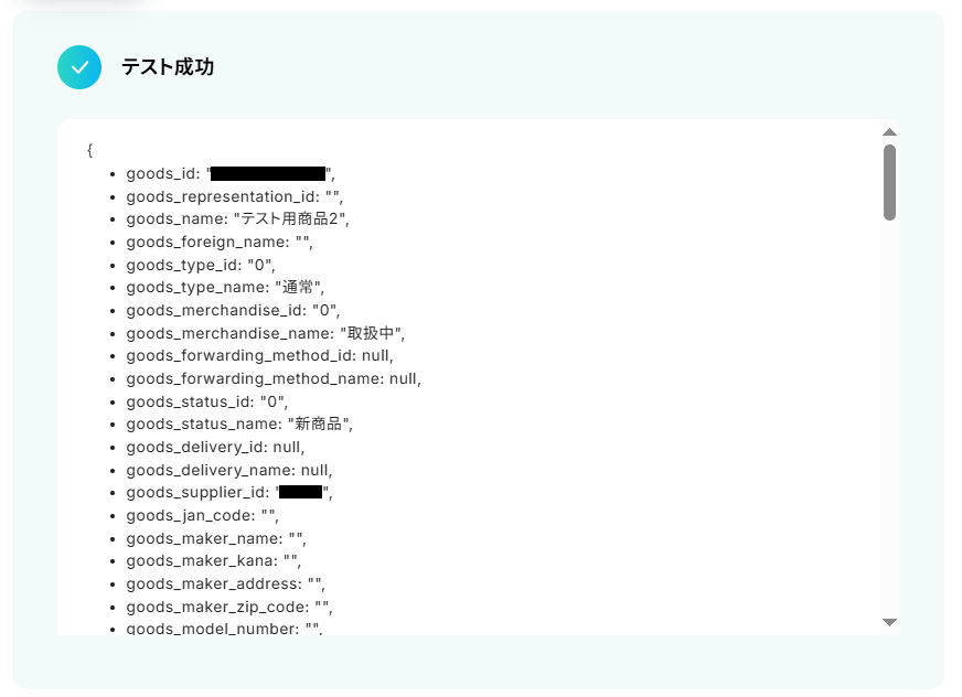 テストに成功するとテスト成功画面が表示され、取得した値が表示されます。 取得した値は実行した結果が設定される動的な値として利用できるため、このあとの設定でも使用します。