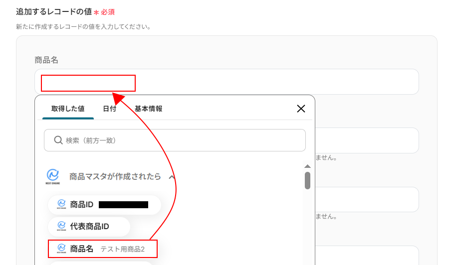 取得した値を活用することで、固定値ではなく、トリガーが実行されるたびに最新の情報が反映できます。 取得した値は以下のように入力欄をクリックすることで設定できます。